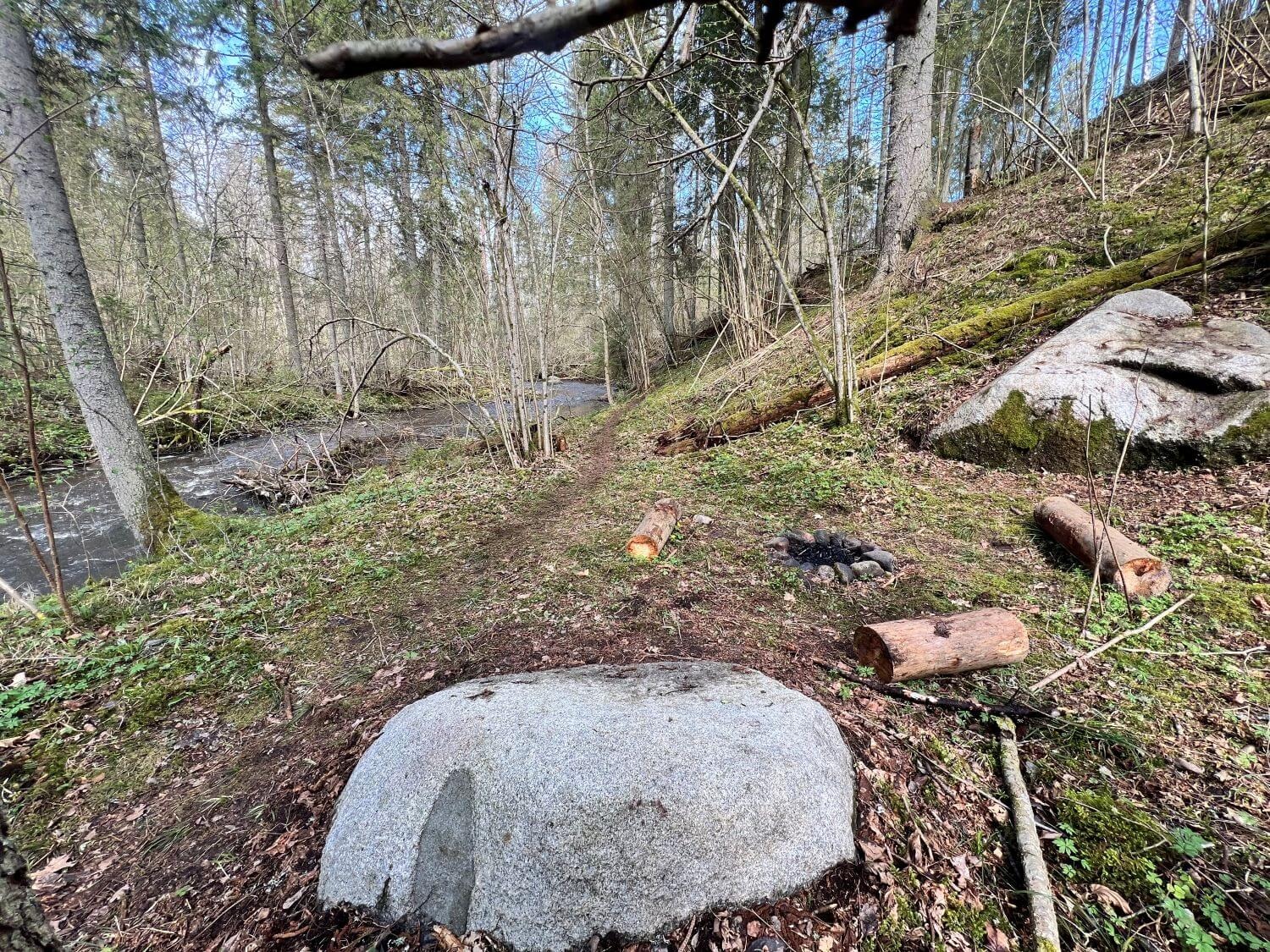 Takas malā ir vairākas ugunskura vietas. Nē, ne tādas glaunas, kā Gaujas malā ar soliem un galdiem, bet tādas, kā jābūt mežā, bluķīši sēdēšanai un akmeņiem izlikts ugunskura aplis. Iespējams, ka ar laiku taps arī kādas uzpariktes, kur pakarināt tējkanniņu vai iestellēt katliņu, bet pagaidām viss ir tik tuvi dabai, cik vien iespējams tai nekaitējot.