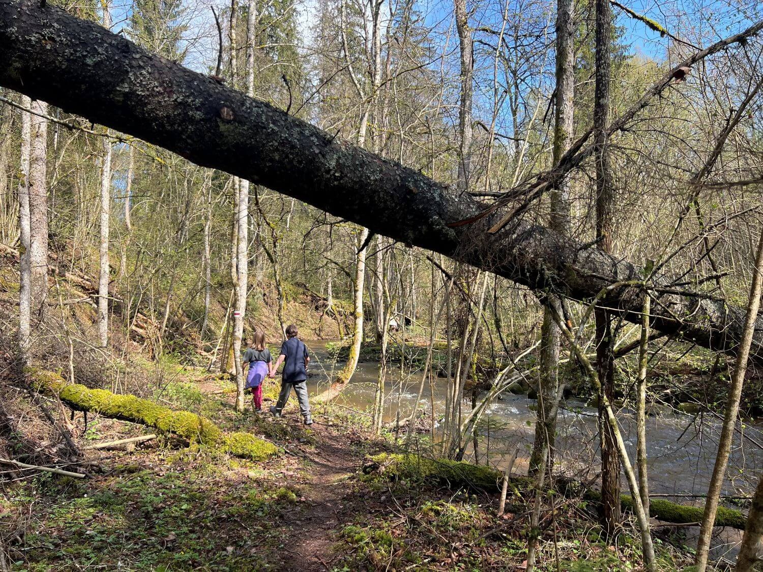 Upes labais krasts ir līdzenāks un taka vijas tuvāk čalojošās upītes saulē zvārguļojošajai straumei, brīžam pat liekas, ka viens nepareizs solis un esi ūdenī. Arī avotiņu tērcītes, kas izgrauzušas krastu, veidojot kritenes, vai mazus dūksnājus, kuriem viegli pārlēkt pāri, vai izlavierēt, meklējot stingrāku pamatni. Te gan pēc daudzajiem gājējiem arī netrūkst žļurgainu nogāžu, bet tās vairs nav stāvas un neliekas tik izaicinošas kā upes kreisajā krastā. Lai nu kā, pēc 4km kājiena bērnu čalas ir norimušas un jau jāsāk piedomāt, kā padarīt gājienu interesantāku. Te tīri labi noderētu šūpoles, bet tās ir palikušas upes otrā krastā, vai kāds nepieradināts baļķis pāri upei uz kura izmēģināt veiksmi. Tā kā nav ne viena, ne otra, tad jāliek lietā dungojamie pantiņi un kāda dziesma, tad tā iešana ir vieglāka un jautrāka.